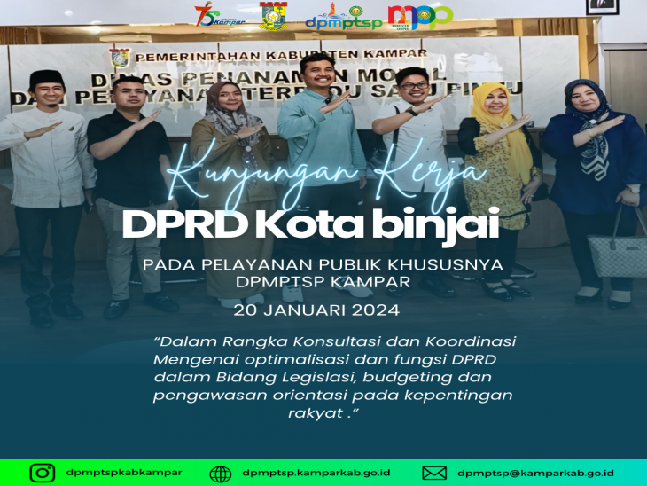 BANGKINANG KOTA - Kunjungan Kerja DPRD Kota Binjai pada Pelayanan Publik Khususnya DPMPTSP Kabupaten Kampar tangal 20 Januari 2025 dalam rangka konsultasi dan koordinasi mengenai optimalisasi dan fungsi DPRD dalam bisa legislasi, budgeting dan pengawasan orientasi pada kepentingan rakyat.