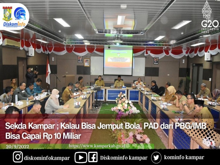 Bangkinang Kota – Sekretaris Daerah Kabupaten Kampar Drs Yusri,M.Si menegaskan, agar seluruh OPD terkait untuk lebih proaktif jemput bola dalam retribusi izin mendirikan Bangunan/persetujuan Bangunan Gedung (PBG/IMB). Hal tersebut ditegaskan Sekda Kampar Yusri ,saat memimpin rapat percepatan pelaksanaan perizinan non perizinan berusaha di Kabupaten Kampar yang dilaksankaan di ruang rapat kantai III kantor Bupati, selasa (20/9/2022).