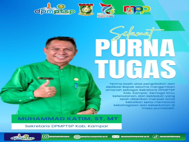 Kampar, 30 Januari 2026 — Dinas Penanaman Modal dan Pelayanan Terpadu Satu Pintu (DPMPTSP) Kabupaten Kampar menyelenggarakan acara perpisahan dan penyerahan cendera mata kepada Sekretaris DPMPTSP, Muhammad Katim, ST, MT, yang telah memasuki masa purnabakti setelah menyelesaikan masa tugasnya sebagai aparatur sipil negara.